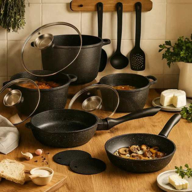 Набір посуду Edenberg EB-8182 з 17 предметів. Цей набір зручний і простий у використанні та догляді. Завдяки цьому набору посуду ви зможете із задоволенням готувати улюблені страви. Для очищення посуду можна використовувати посудомийну машину.