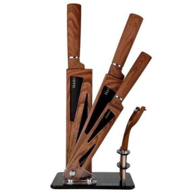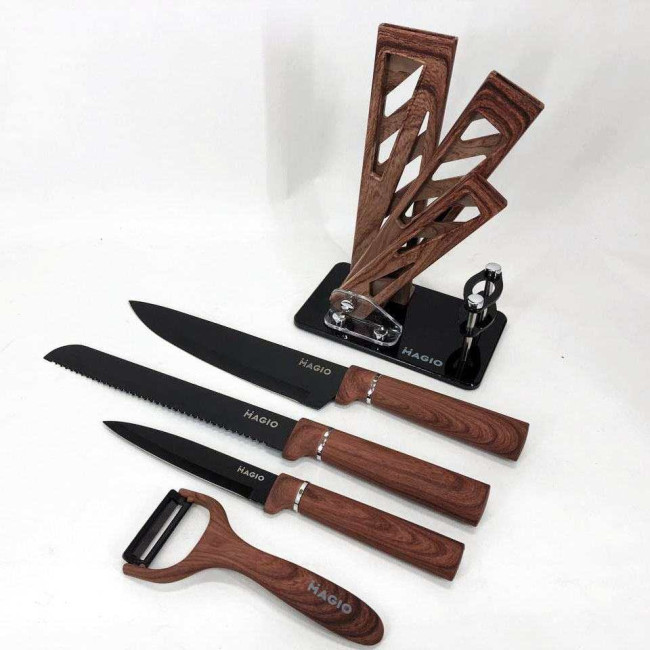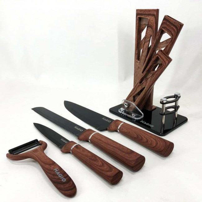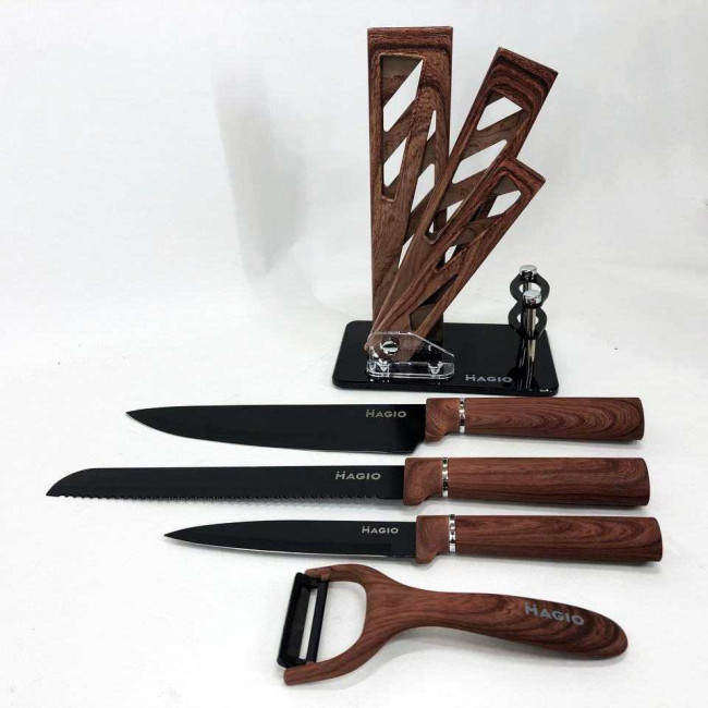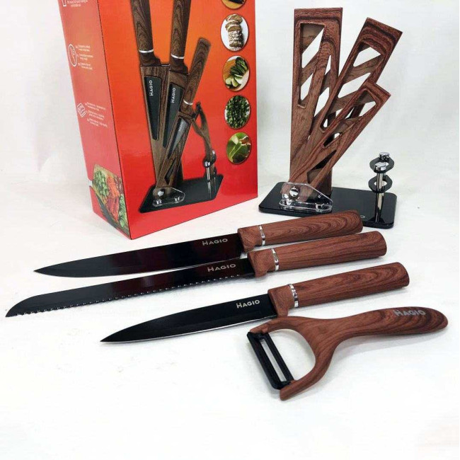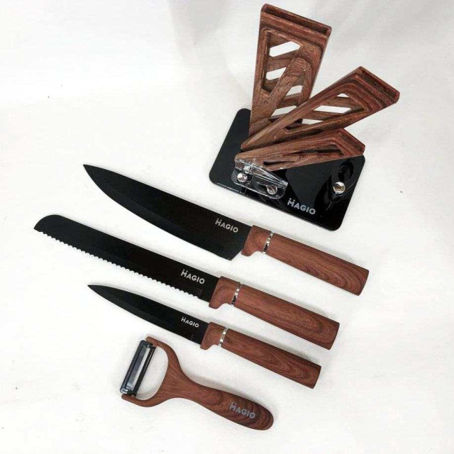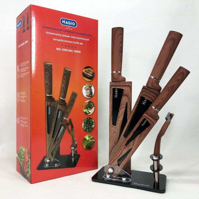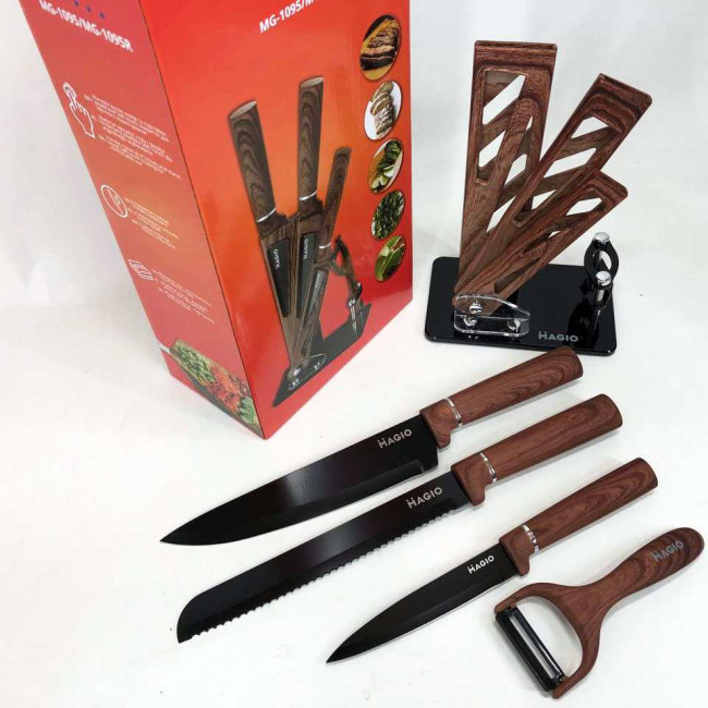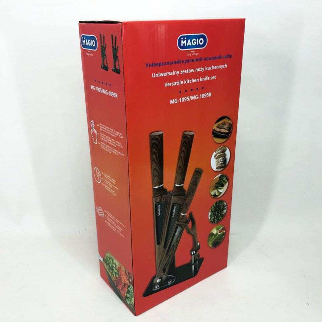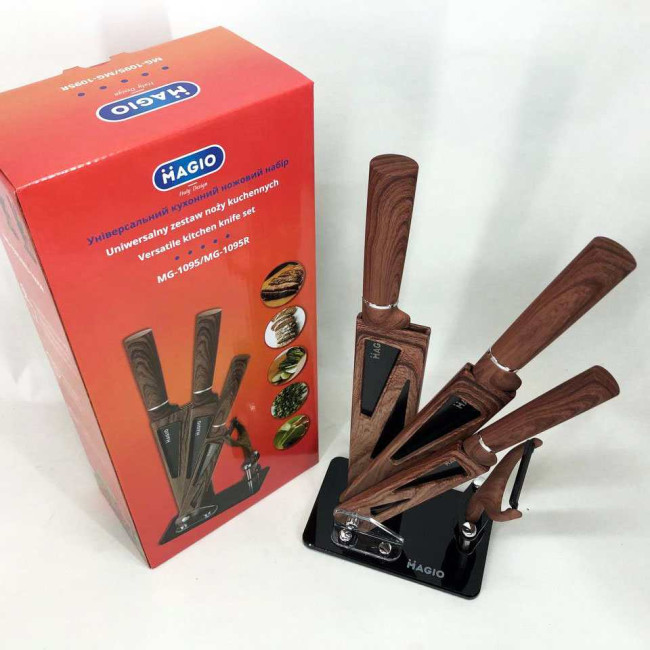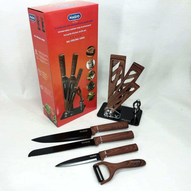 - Комплектація: ніж шефа (1 шт), ніж для хліба (1 шт), слайсерний ніж (1 шт), універсальний ніж (1 шт), овочечистка (1 шт), підставка (1 шт)
