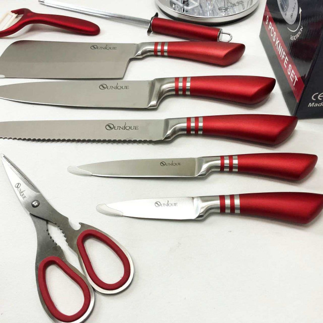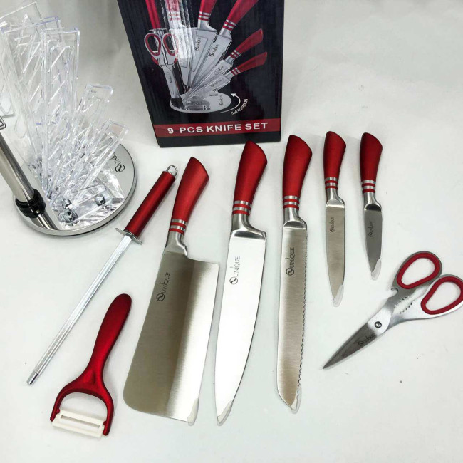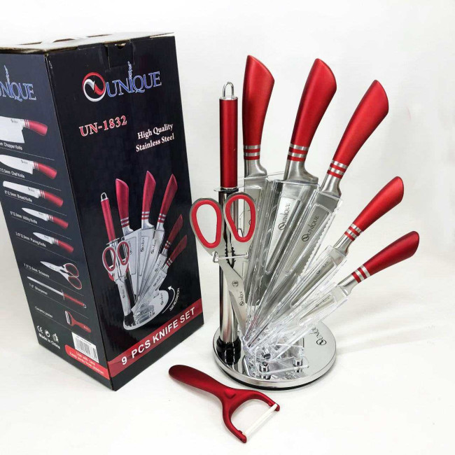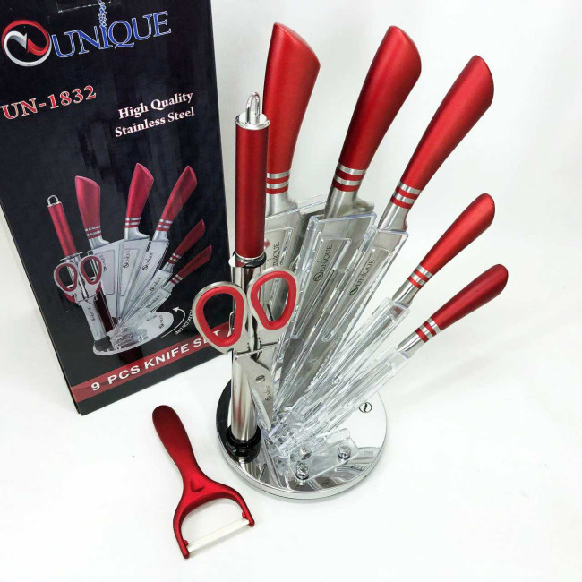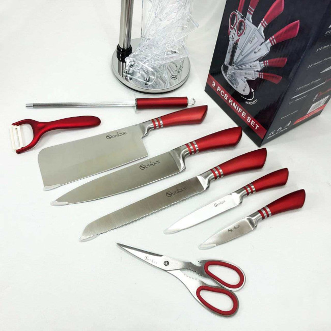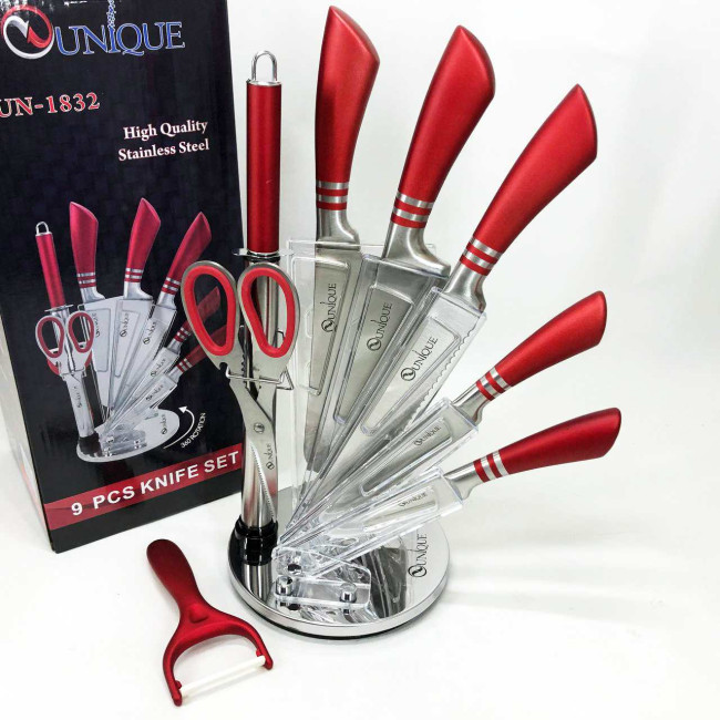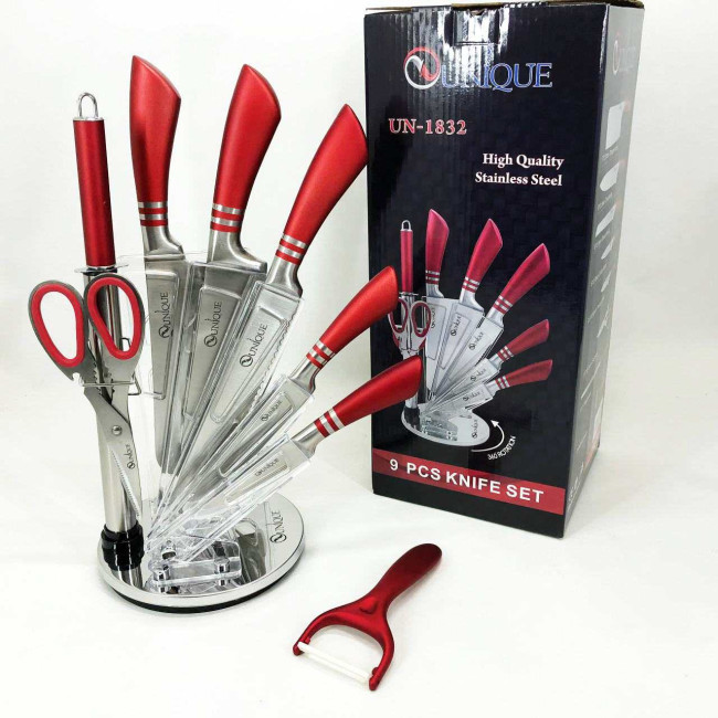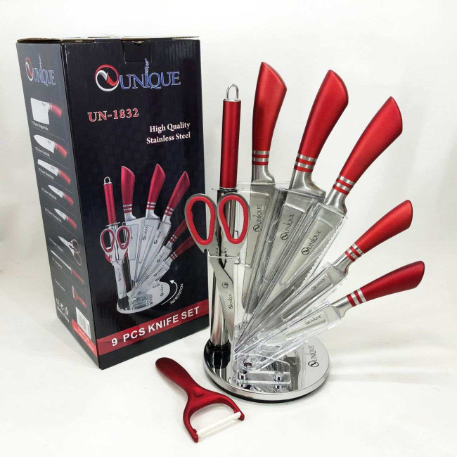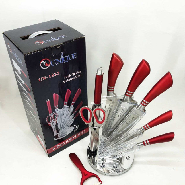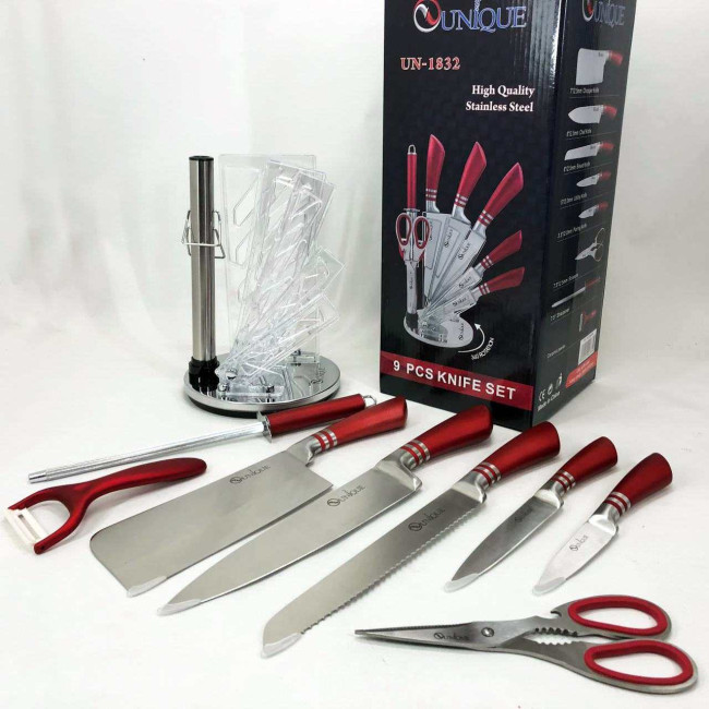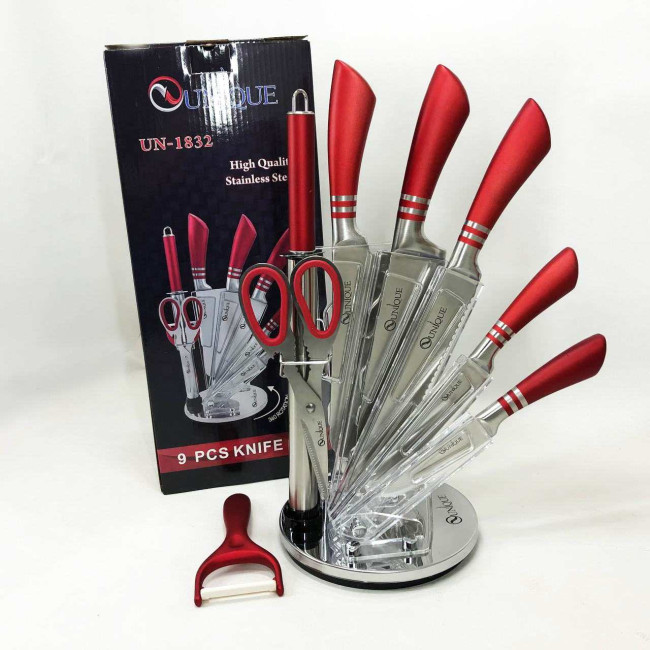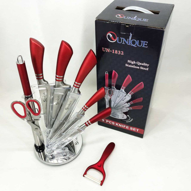 Набір ножів UNIQUE UN-1832 з підставкою 9 предметів овочечистка точилка ножиці Нержавіюча сталь