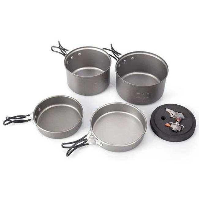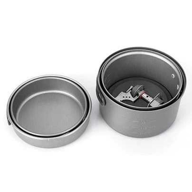 Набір складається з двох каструль об’ємом 0.8 і 1.2 л, газового пальника Kovea Supalite Titanium KB-0707 (сумісна з газовими балонами різьбового стандарту або з цанговими балонами через перехідник) та двох сковорідок-кришок з прогумованими ручками.