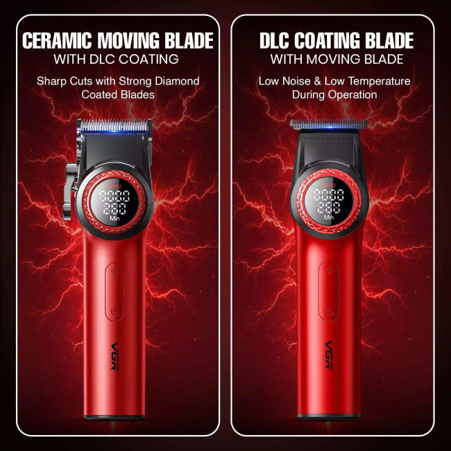 Комплект VGR — це найкращий набір для догляду за собою для професіоналів та особистого використання. Цей преміальний набір включає машинку для стрижки волосся V-001 та триммер для волосся V-977, оснащені потужним двигуном BLDC, що забезпечує швидкість до 9000 об/хв для машинки та 8000 об/хв для тримера, гарантуючи точне та ефективне стриження. Оснащений 21-рівневим регулюванням швидкості, керамічними лезами з DLC-покриттям та регульованими важелями, цей комбінований набір гарантує точність, швидкість та тривалу роботу. Його світлодіодний дисплей надає важливу інформацію в реальному часі, таку як швидкість, час роботи та заряд акумулятора. Завдяки акумулятору 4600 мАг для машинки для стрижки та акумулятору 2500 мАг для тримера ви можете користуватися пристроєм до 300 хвилин після повної зарядки. Цей професійний набір для перукарів — ідеальний вибір для точності, довговічності та універсальності.