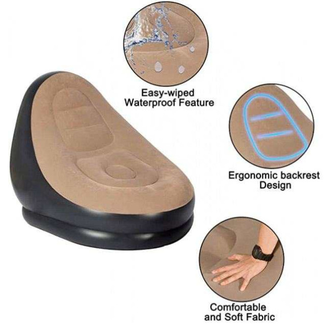 Водонепроникна верхня частина, бічні сторони та нижня частина. Клапан має дуже широкі отвори для швидкого наповнення та швидкого спуску. Складається компактно для зберігання. Портативні та універсальні меблі можна використовувати для кемпінгу, відпочинку будинку та багато іншого; надувається за лічені хвилини. Включає крісло і пуфик, виготовлені з міцного, перевіреного матеріалу; м’які, водонепроникні устілки зверху, з боків та знизу. Клапан «два в одному» має дуже широкі отвори для швидкого надувки та здуття