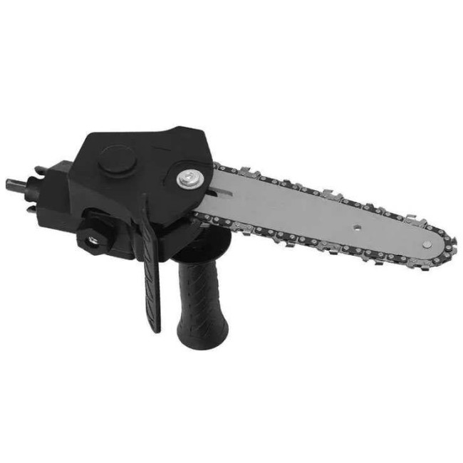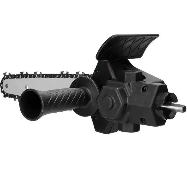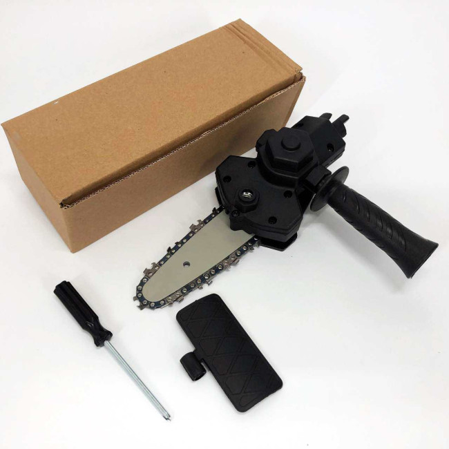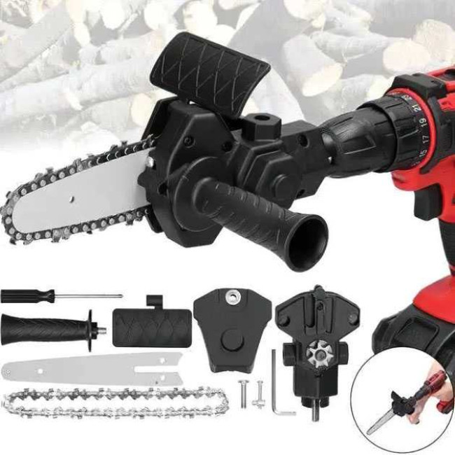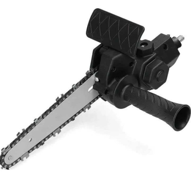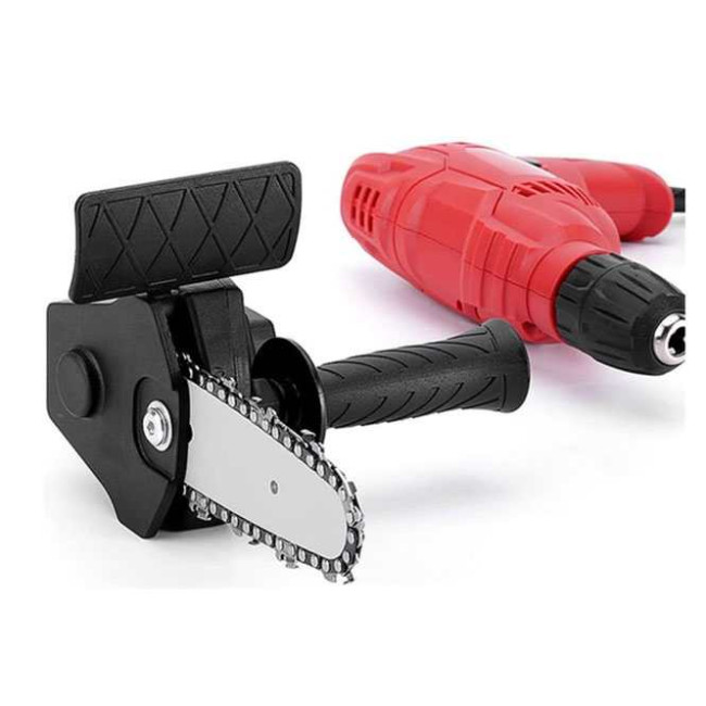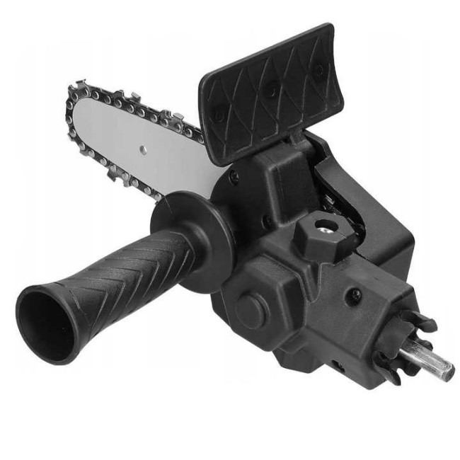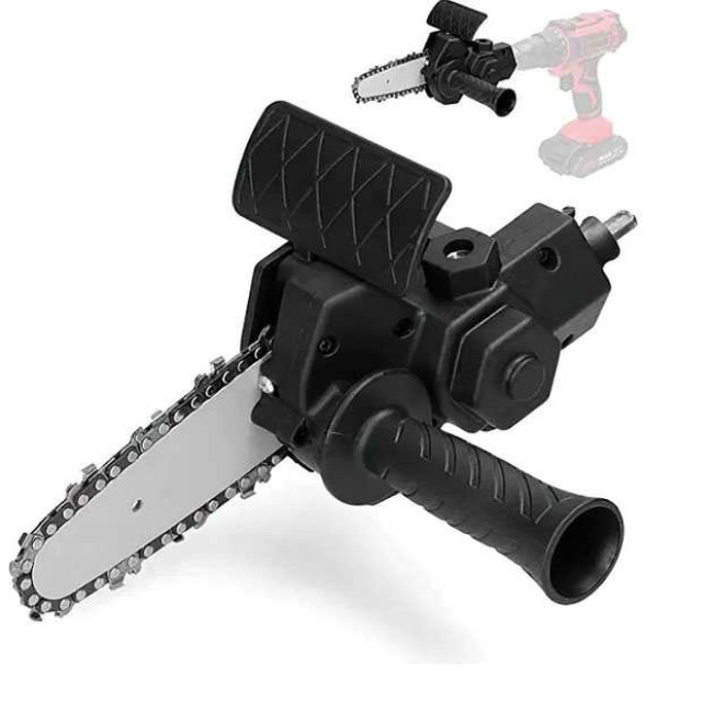 Насадка-адаптер на дриль (шурупокрут) у вигляді ланцюгової пили створена для ефективного різання деревини з використанням електричної дрилі або шурупокрута як тягового інструмента. Цей пристрій демонструє стабільну та високу продуктивність при роботі на підвищених обертах. Адаптер виготовлений з міцного інженерного АБС-пластику та сталі, що забезпечує стійкість до зношування та тривалий термін служби. Підходить для обробки різних порід деревини, включаючи розпилювання гілок і роботи з деревиною. Затискний діаметр дрилі – 40-44 мм (рекомендована швидкість обертання понад 2500 об/хв).