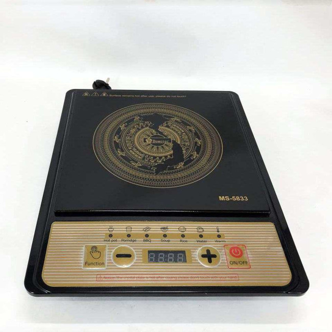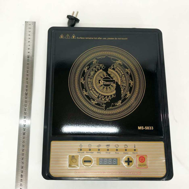 Плита Domotec MS-5833 — одноконфоркова індукційна електроплита, потужністю 2000 Вт, яка миттєво нагрівається і швидко готує їжу. Сенсорний дисплей перетворить процес керування плитою на цікаве заняття. Кристалічне скло, з якого зроблена техніка, міцне та стійке до подряпин, легко очищається від забруднень. Прилад встановлюється на стіл, не ковзає поверхнею. Плита електрична настільна сумісна з усіма видами індукційного посуду. Сенсорна кнопкова панель керування. Швидке та рівномірне нагрівання на всій нагрівальній поверхні. 7 режимів (програми) приготування: розігрівання, смаження, барбекю, кип’ятіння, суп, каша з молоком, рис.