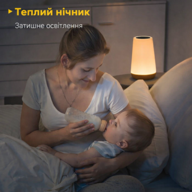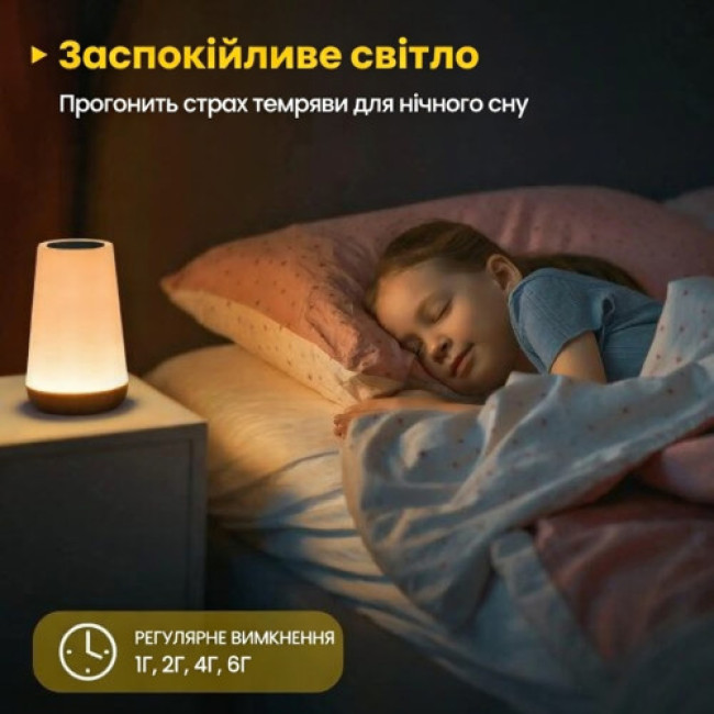 Сенсорна панель реагує на дотик, забезпечуючи швидке керування без зайвих кнопок. Для більшої зручності передбачено пульт дистанційного керування: можна змінювати кольори, регулювати яскравість, перемикати режими світіння та встановлювати таймер вимкнення (1, 2, 4 або 6 годин).