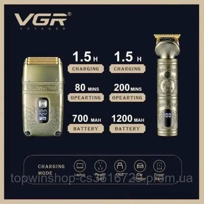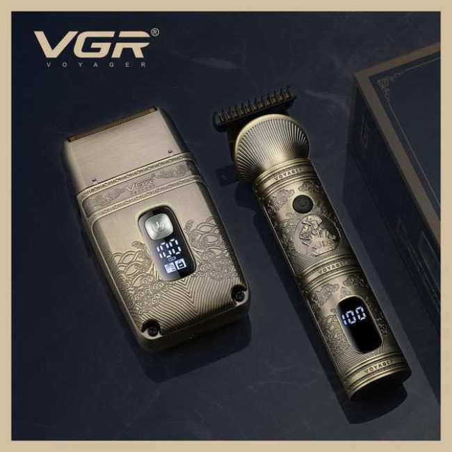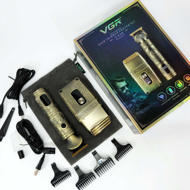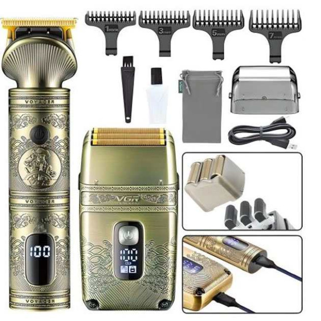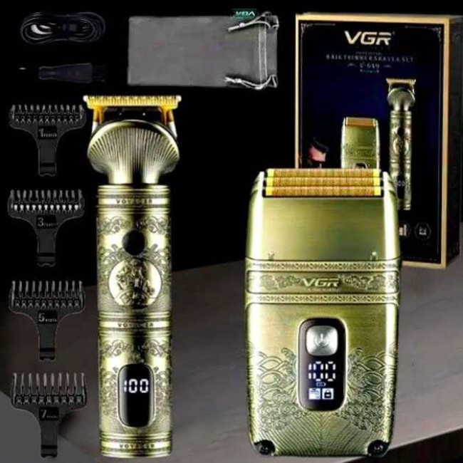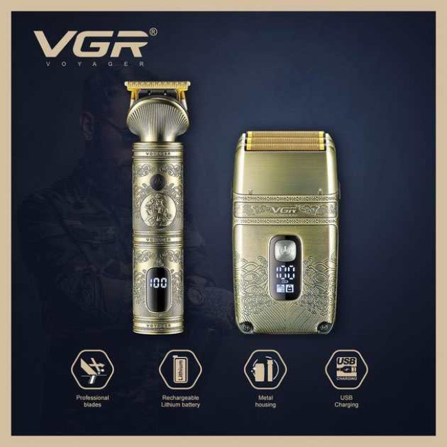 VGR Voyager V-649 Professional Hair Trimmer Shaver Set – це набір, що складається з тримера та електробритви. Тример для бороди і вусів і бритва мають ножі з нержавіючої сталі, що дозволяє їм справлятися навіть з найжорсткішим волоссям. Обидва інструменти мають захист від води IPX6, що дозволяє брати їх із собою в душ, не боячись зіпсувати, а також мають елегантний дизайн із гравіюванням.