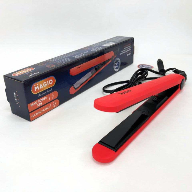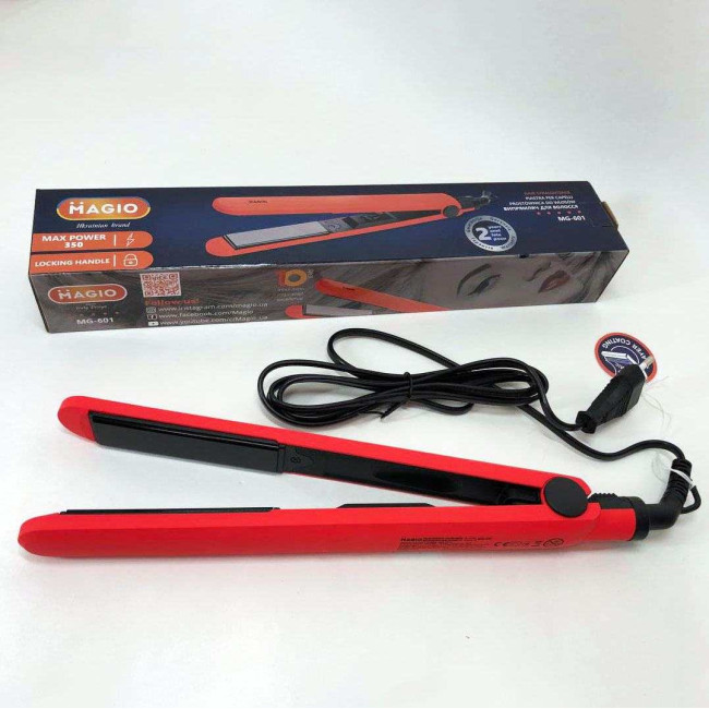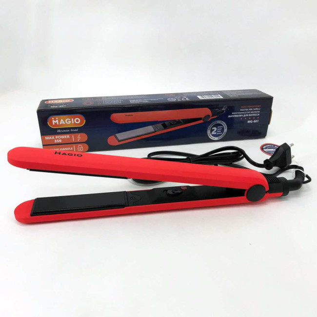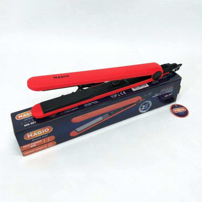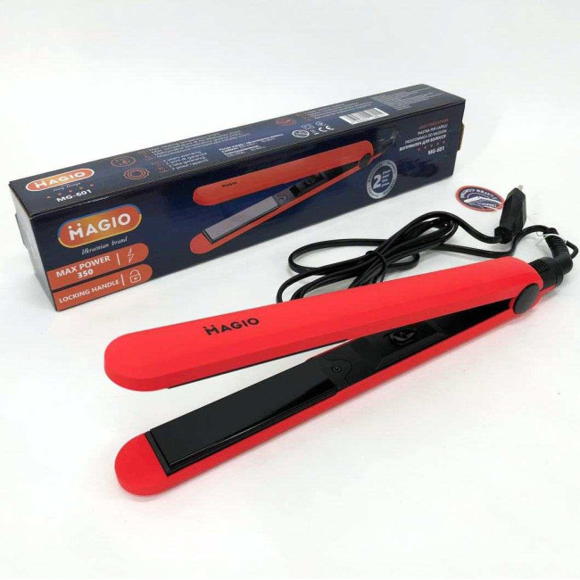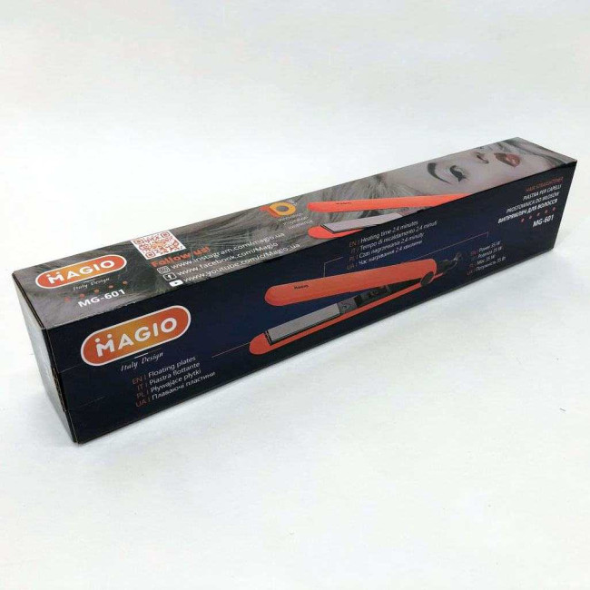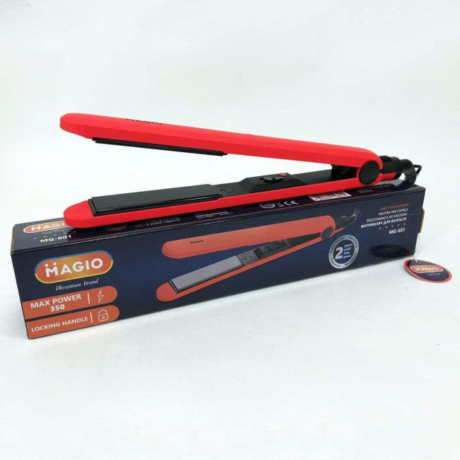 Випрямляч для волосся Magio MG-601 має стильний тонкий корпус. Абсолютна простота – ключова особливість моделі. Корпус виконаний з приємного на дотик високоякісного пластику, який запобігає плавленню при нагріванні та гарантує тривалий термін служби інструменту. Матеріал поверхні робочих пластин – двошарова кераміка, що впливає не тільки на кінцевий результат зачіски, але й на здоров’я волосся. Такий вид пластин завдає найменшої шкоди, швидко та рівномірно нагріваються, легко ковзають по волоссю та запобігають електризації. Випрямляч оснащений подовженими (90 мм) нагрівальними пластинами шириною 24 мм, які дозволяють досягти ідеальних результатів за короткий час. Випрямляч швидко нагрівається і буде готовий до використання менше ніж за хвилину. Петелька для підвішування і шнур, що обертається на 360° довжиною 1,8 м створюють додаткову зручність при використанні.