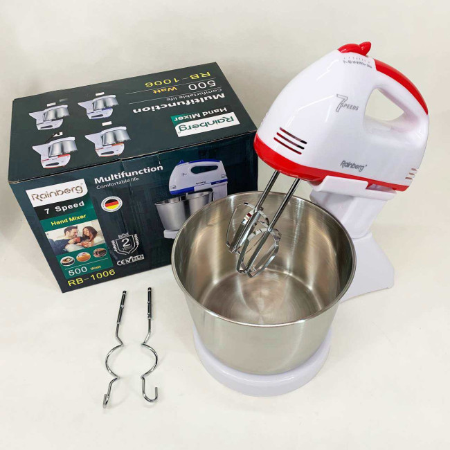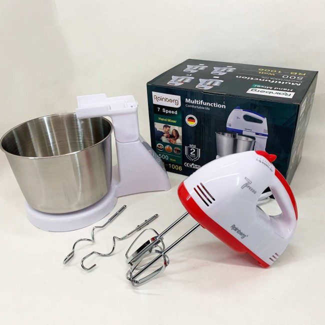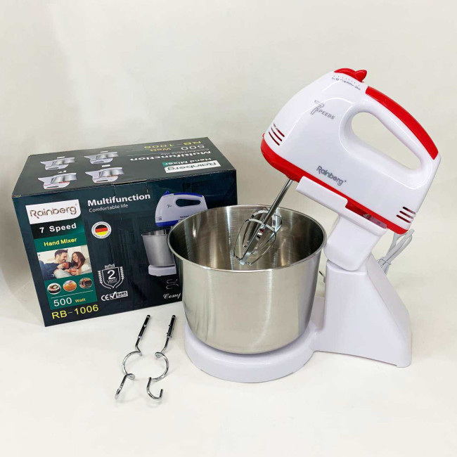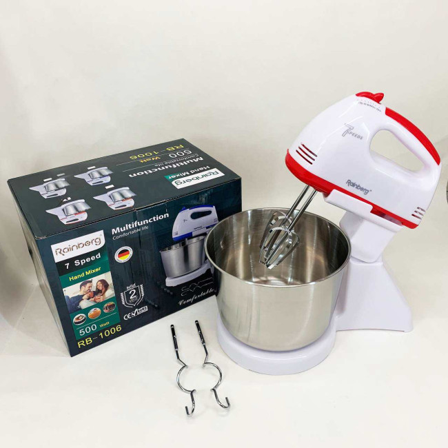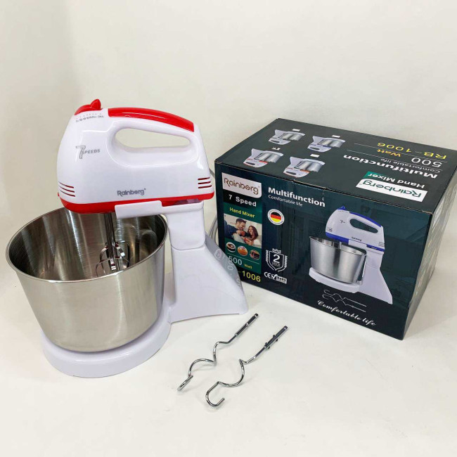 Завдяки 7 швидкісним режимам і високої потужності міксера Rainberg RB1006 , яка складає 500W, Ви з легкістю відтворите всі види тіста, від рідкого, повітряного, до щільного і міцного тіста. А два віночки для збивання дозволять швидко і якісно збити потрібний Вам продукт, будь то яєчні білки або повітряне суфле. Міксер Rainberg RB1006 — прилад дуже зручний та легкий у використанні та очищенні.
