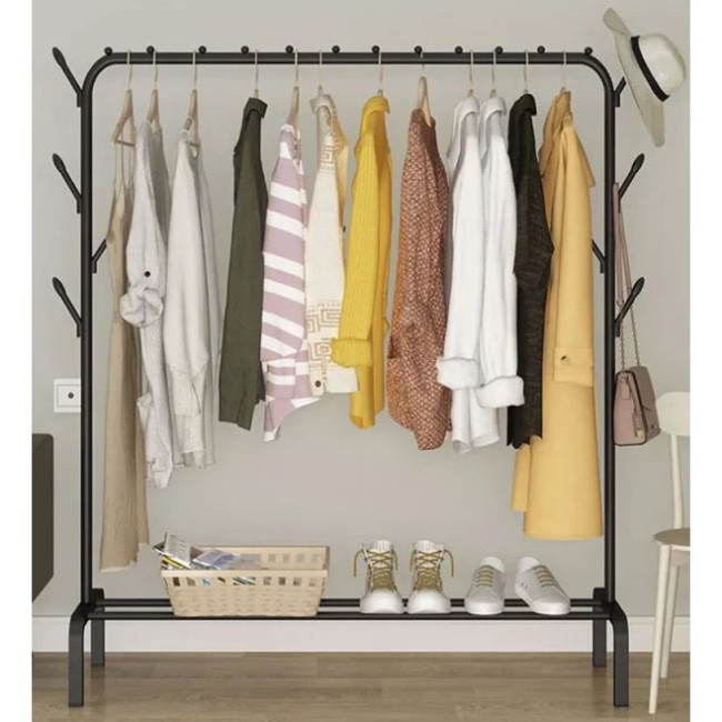 - Практичне використання: стійка оснащена міцною поперечиною для одягу на вішалках, а також додатковими гачками з боків для розміщення аксесуарів, сумок або головних уборів.