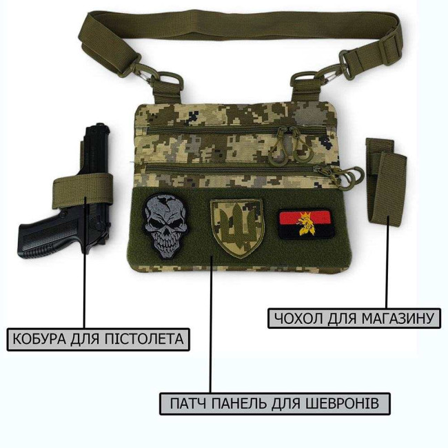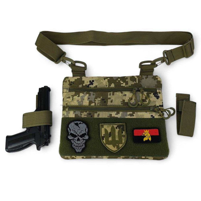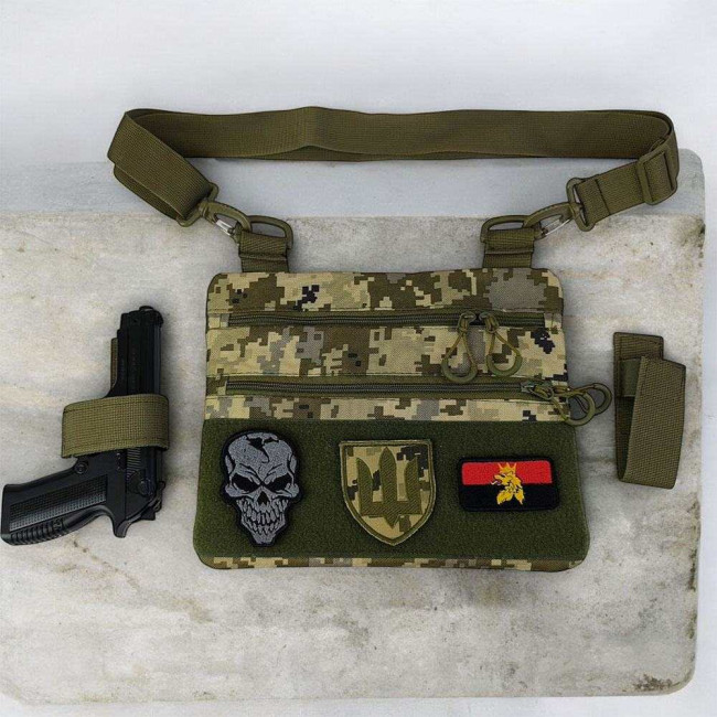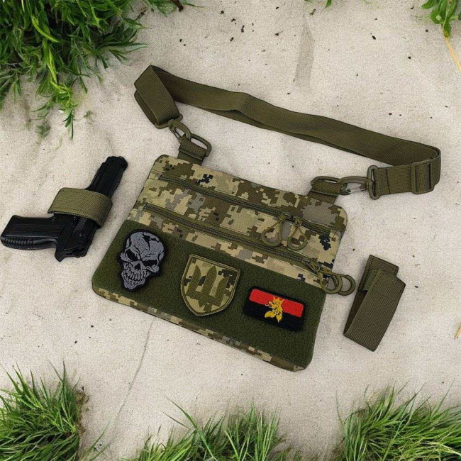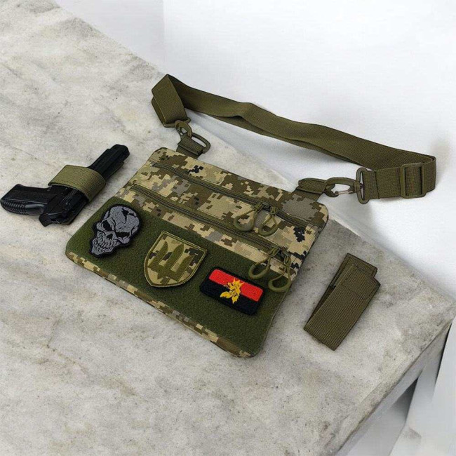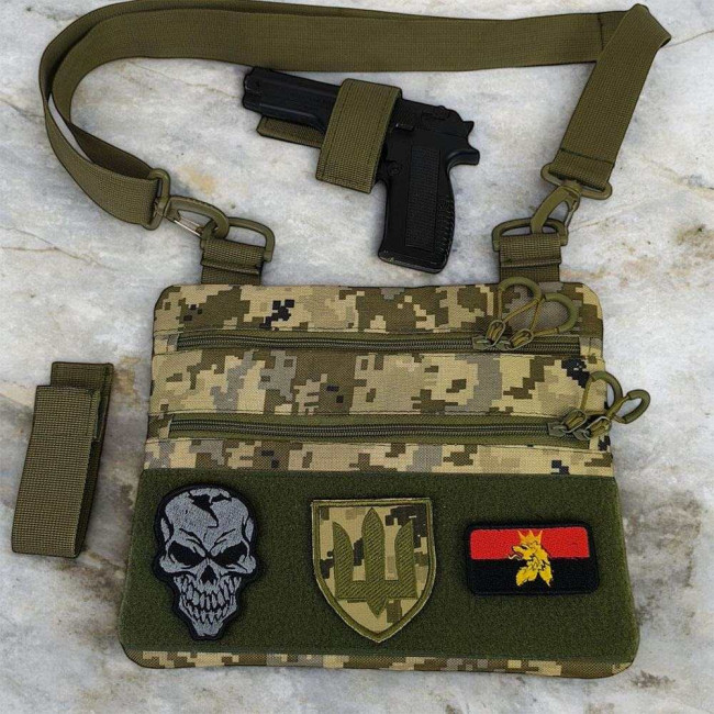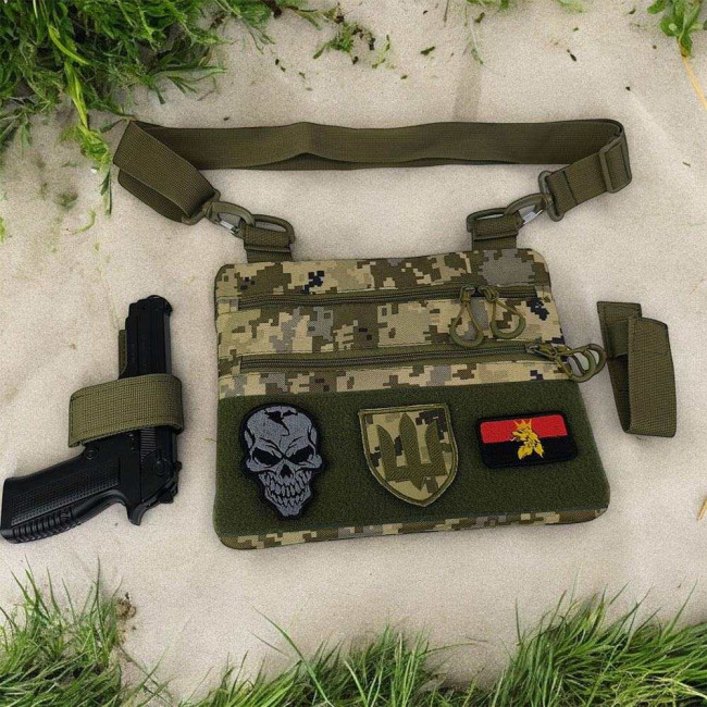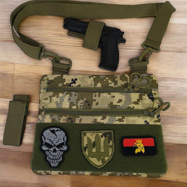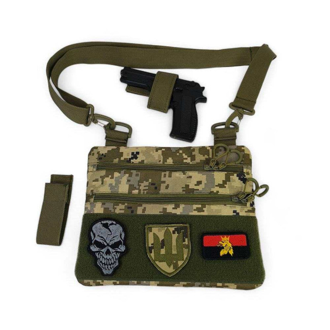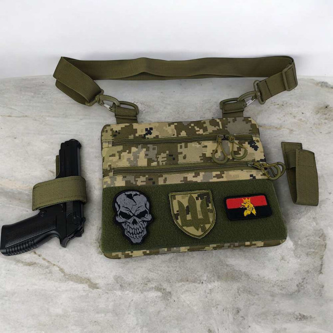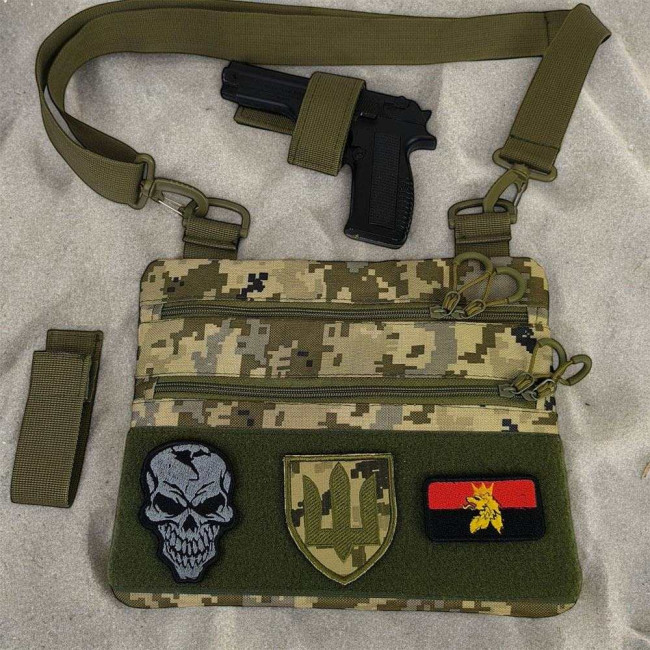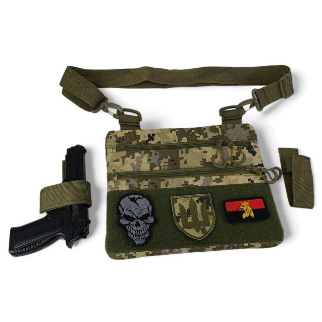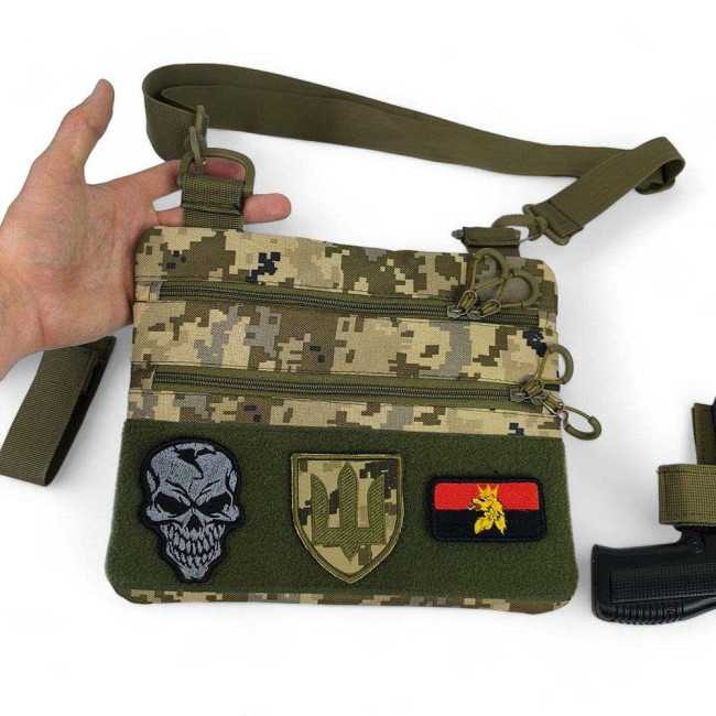 Ця тактична наплічна сумка-кобура з піксельним камуфляжем є ідеальним рішенням для скритого носіння пістолета. Виготовлена з високоякісної тканини кордура, вона забезпечує надійний захист вашого зброї та аксесуарів. Розмір сумки 30 х 24 см.
