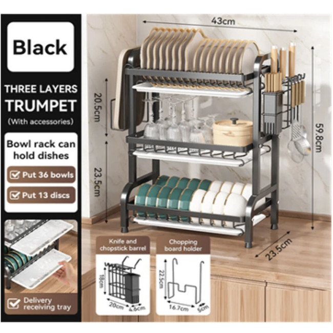 Сушарка для посуду тришарова чорного кольору з піддоном — це функціональне та стильне рішення для вашої кухні, яке дозволить організувати процес сушіння посуду максимально зручно та гігієнічно. Продумана багаторівнева конструкція сприяє ефективному використанню простору, а чорне колірне виконання доповнить інтер’єр сучасним акцентом.