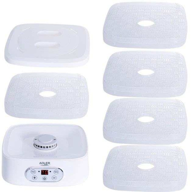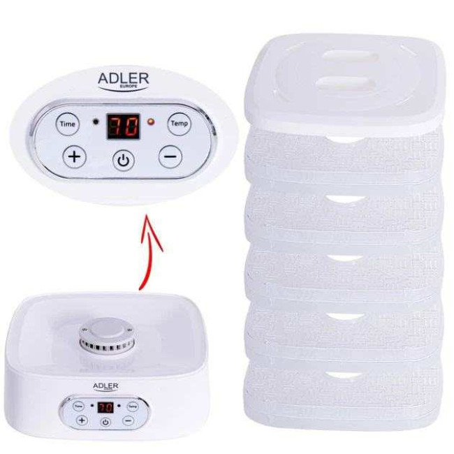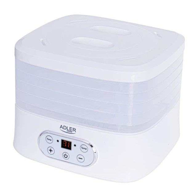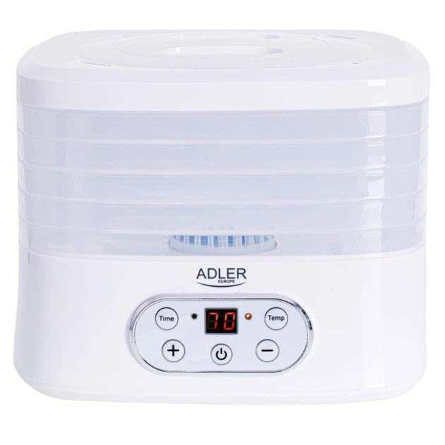 Сушарка для овочів і фруктів Adler AD 6658 має максимальну потужність 550 Вт і дозволяє регулювати температуру висушування в діапазоні від +35 до +75 градусів Цельсія. Для зручності користувачів передбачено таймер до 70 годин. Вам не потрібно буде чекати кінця процесу приготування, прилад відключаться сам після закінчення часу, виставленого на таймері. Це важливі фактори, щоб купити електричну сушарку для овочів та фруктів, щоб заготовити на зиму корисні та смачні продукти.