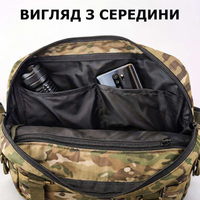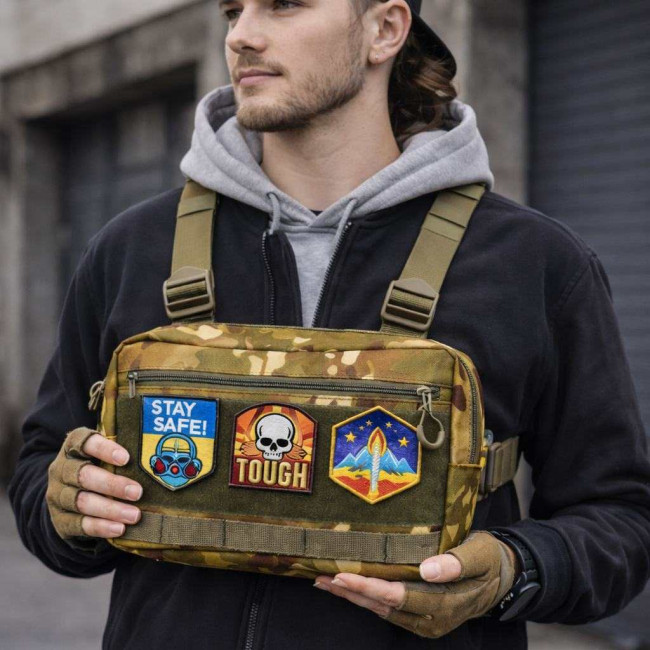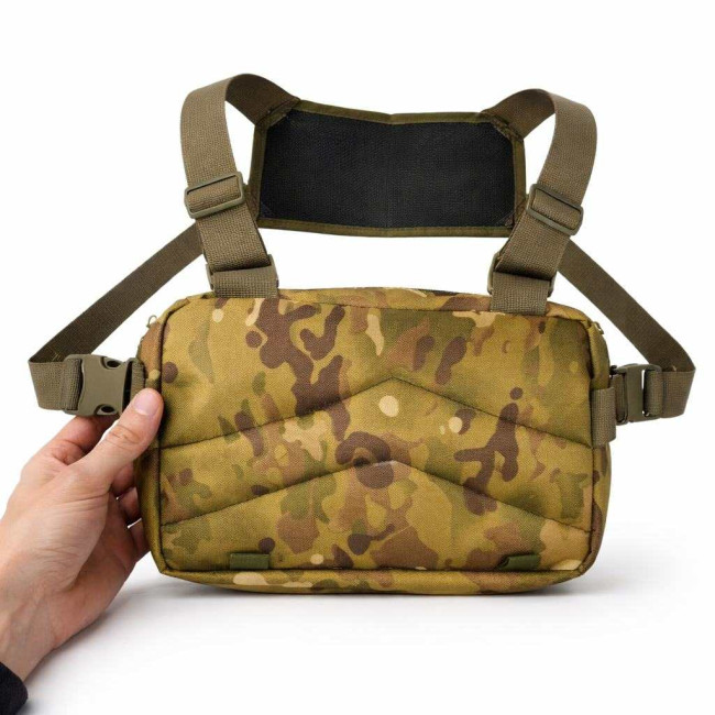 Тактична нагрудна сумка з тканини Multicam для щоденного носіння та активного використання. Виготовлена з Cordura 1000D (нейлон) — міцної зносостійкої тканини, яка добре тримає форму та витримує інтенсивні навантаження. Сумка має 5 кишень для організації речей, патч-панель (Velcro) для шевронів/патчів та систему MOLLE для кріплення додаткового спорядження.
