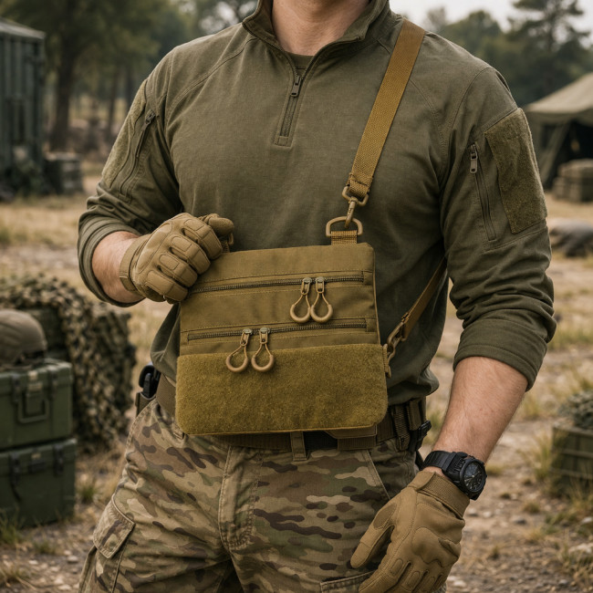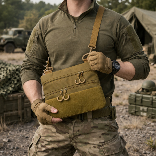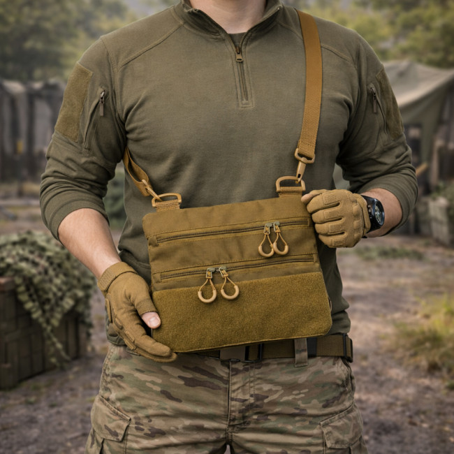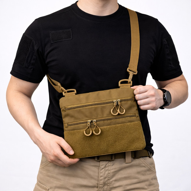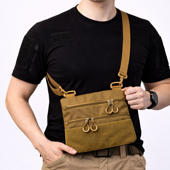 Ця практична та стильна тактична сумка-кобура в кольорі койот — ідеальне рішення для щоденного використання, міста, поїздок або прихованого носіння.