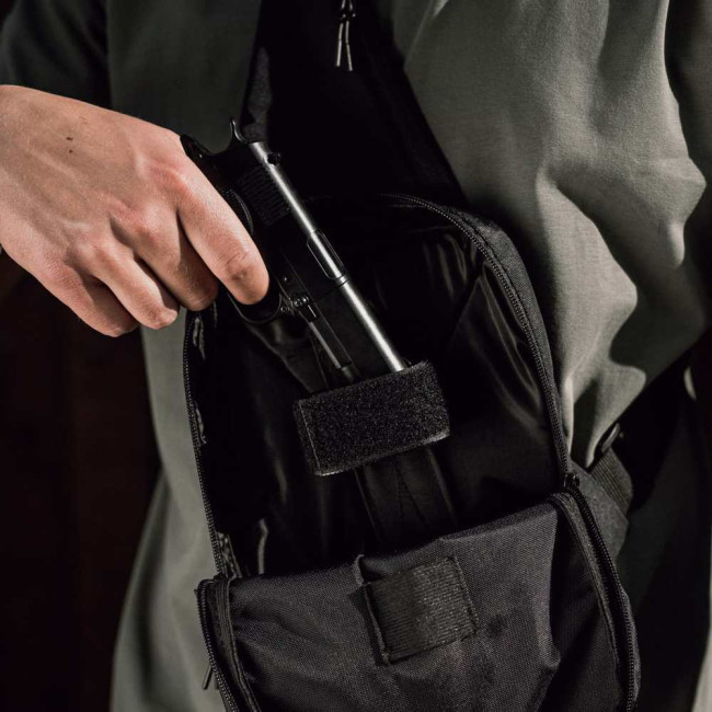 У сумці є механізм миттєвого відкидання основного відділення, для швидкого використання пістолета.