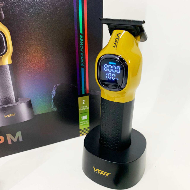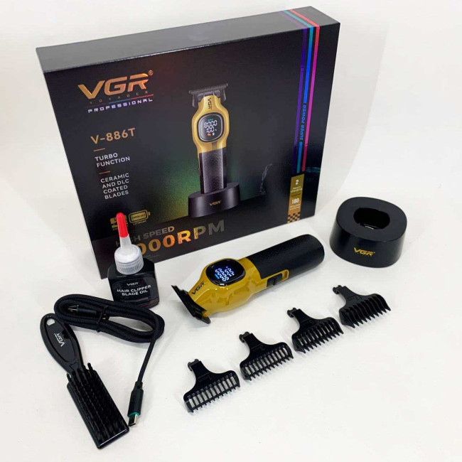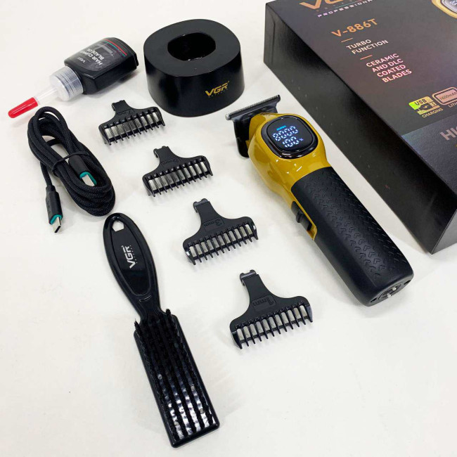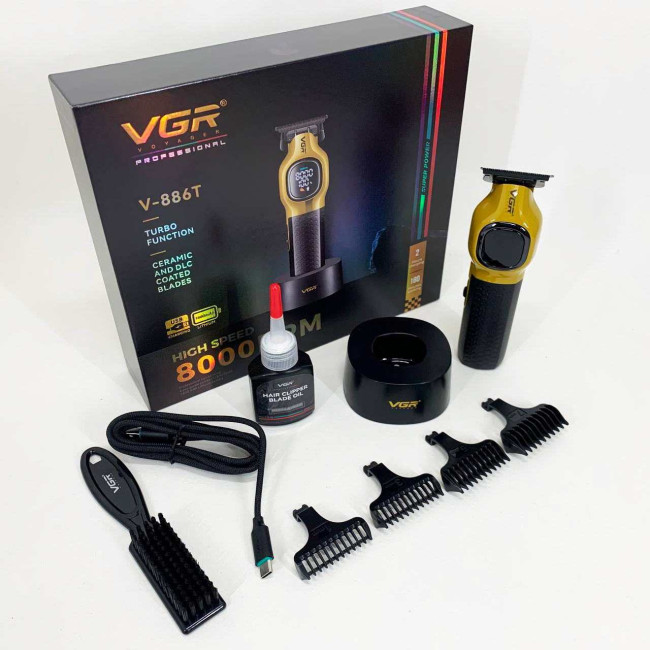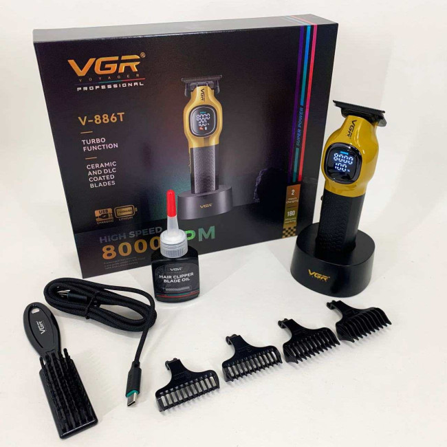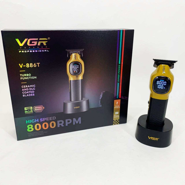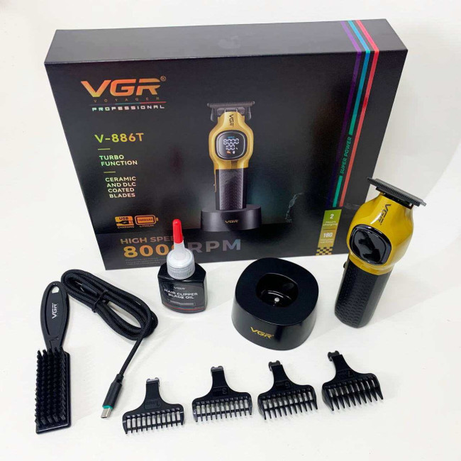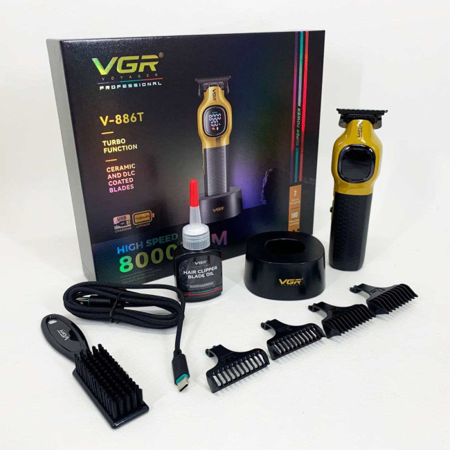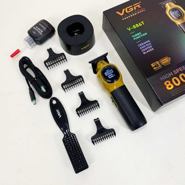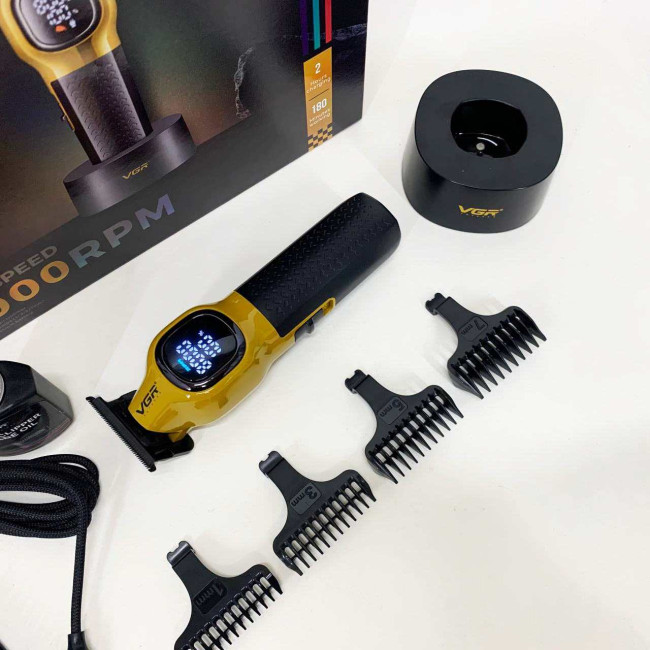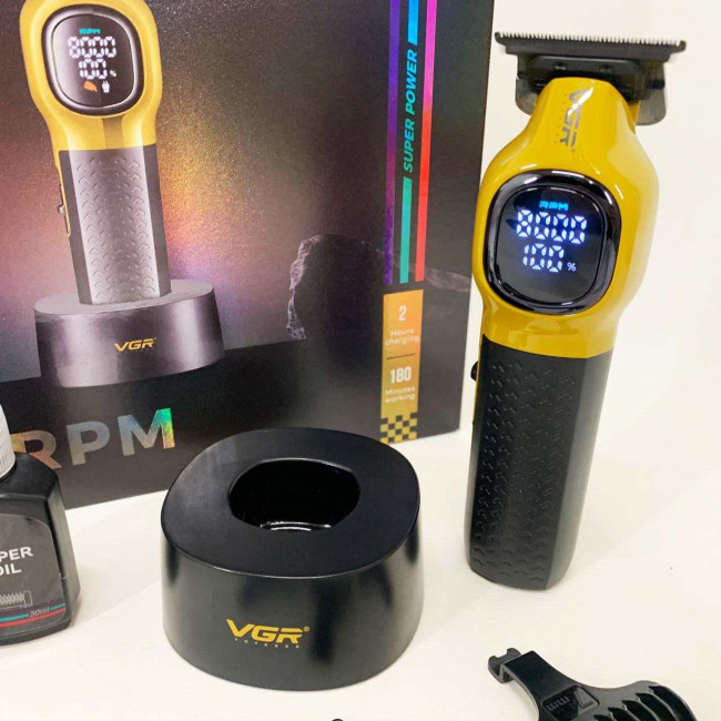 Тример VGR V886T– професійна машинка для точної стрижки та моделювання. Високошвидкісний мотор 8000 об/хв та керамічне лезо з металу забезпечують плавний та стабільний зріз. Літієва батарея 1600 мА працює до 200 хвилин, LED-дисплей відображає оберти, заряд і індикатор мастила. USB-зарядка та зарядна база роблять пристрій зручним як для дому, так і для салону. У комплект входять чотири насадки 1, 3, 5, 7 мм для різних технік стрижки.
