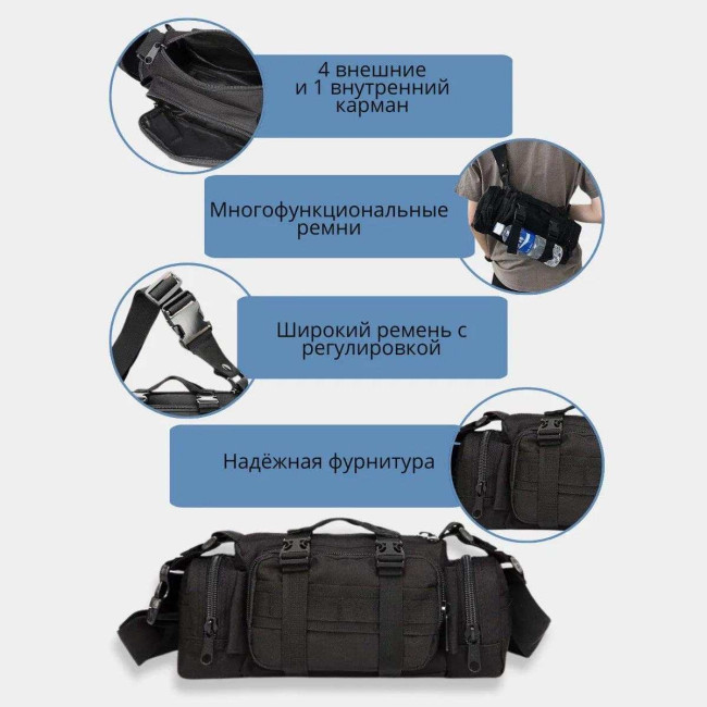 Ця тактична сумка – ідеальне рішення для активних людей! Ви можете використовувати її як поясну сумку, носити через плече або закріпити на спорядженні завдяки системі MOLLE. Підходить для військових, туристів, рибалок, мисливців та навіть велосипедистів. Завдяки компактним розмірам та великій кількості кишень, вона чудово підходить для повсякденного використання та екстремальних умов.