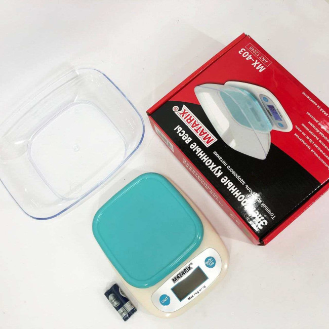 Ця модель електронних ваг відрізняється своєю точністю, невибагливістю, дизайном, невеликою вагою, зручними габаритами. У кухонних терезах МХ-403 зібрані всі властивості, необхідні для зважування продуктів та інгредієнтів, а завдяки співвідношенню ціна-якість ставить цю модель на перше місце. Модель електронної ваги для кухні MX-403 працює від батарейок 1.5VX2 AАА, має режим тара та автовимкнення.