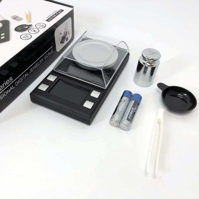 - У комплекті передбачено всі необхідні аксесуари: калібрувальна гирька 100 г, тарна чаша та мініпінцет