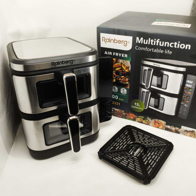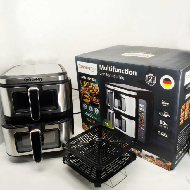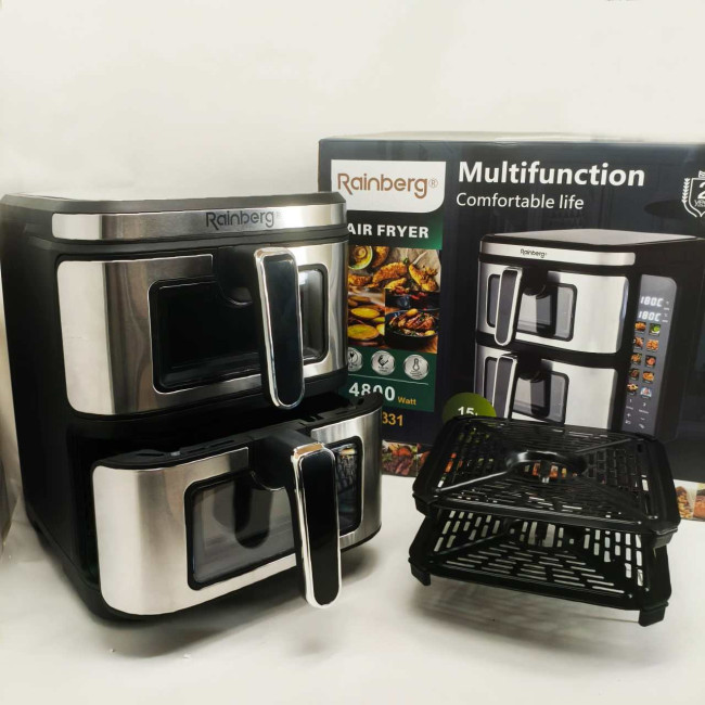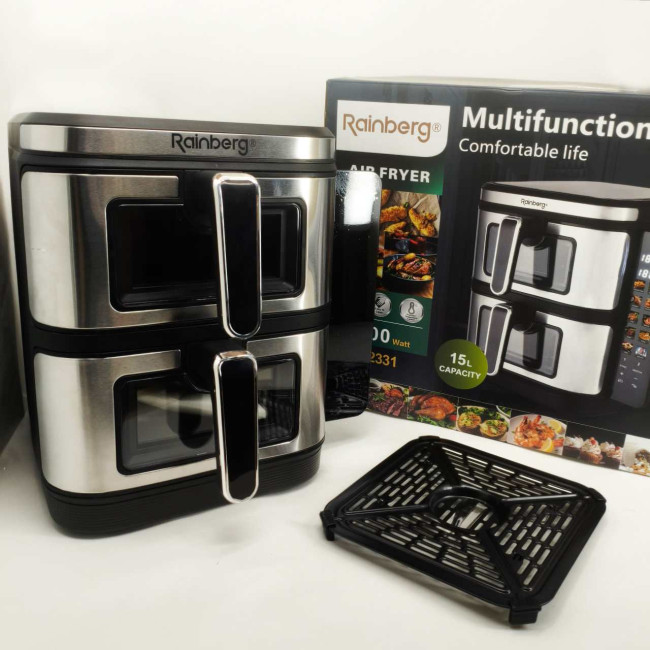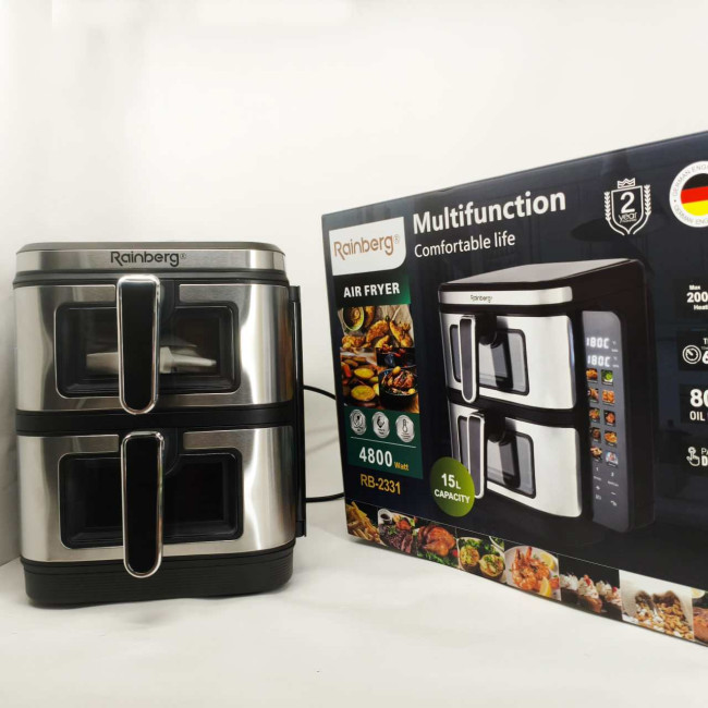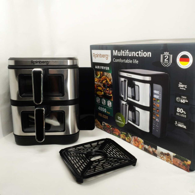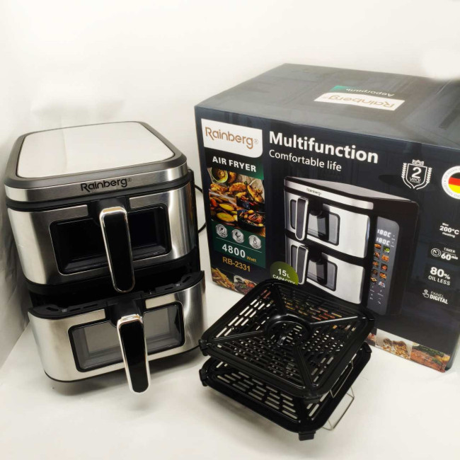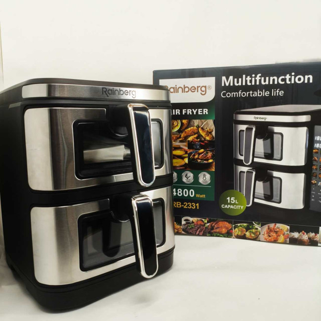 Велика аерофритюрниця 15л на 2 чаші Rainberg RB-2331 Аерогриль посиленою потужністю 4800Вт з дисплеєм
