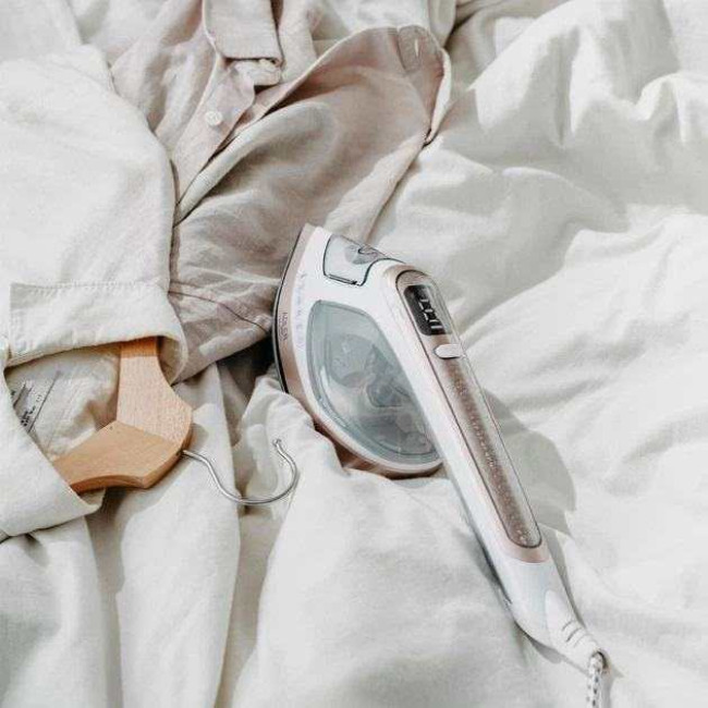 - Керамічна підошва праски — точно гладить будь-яку тканину та забезпечує комфортне прасування навколо гудзиків завдяки загостреному кінчику.